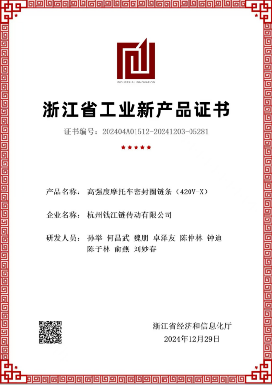 High-Strength Motorcycle Oil-Sealed Chain Model 420V-O(X) na Binuo at Ginawa ng Hangzhou Qianjiang Chain Industries Co., Ltd. Pumasa sa Provincial-Level New Product Certification