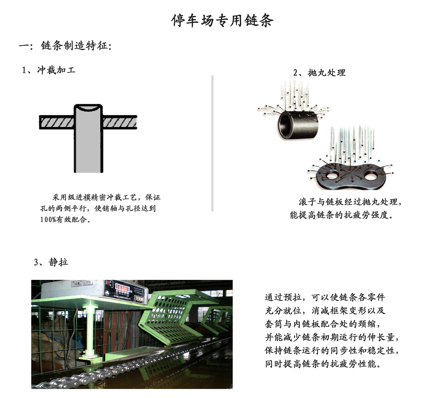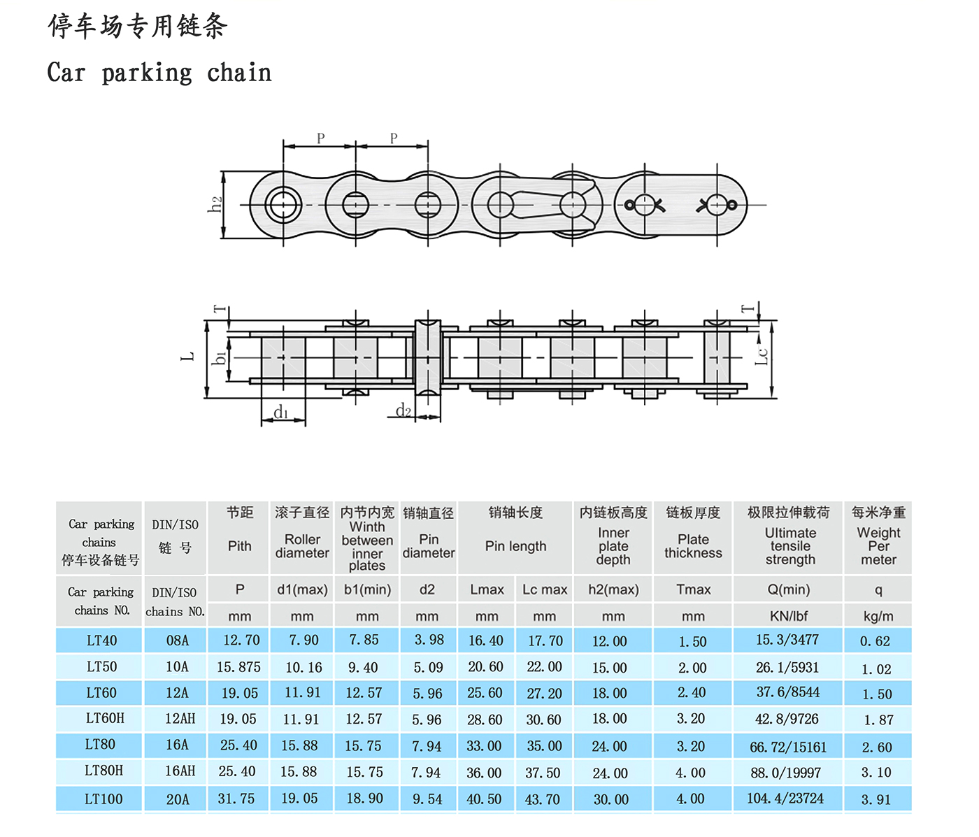 Ang chain ng intelligent na three-dimensional na kagamitan sa parking lot ay ang pangalawang yugto ng paghahatid ng pangunahing katawan ng kagamitan sa paradahan. Ang pamantayan sa pagpapatupad ay JB/T11079-2011. Ang mga katangian ng paggamit ng chain: malaking carrying capacity, mataas na tensile strength (static strength), ang pinakamababang tensile strength ay 10%-30% na mas mataas kaysa sa ordinaryong precision roller chains', ang index ng distortion, chain length accuracy, fatigue resistance atbp. ay mas mataas din kaysa sa ordinaryong precision roller chains'.