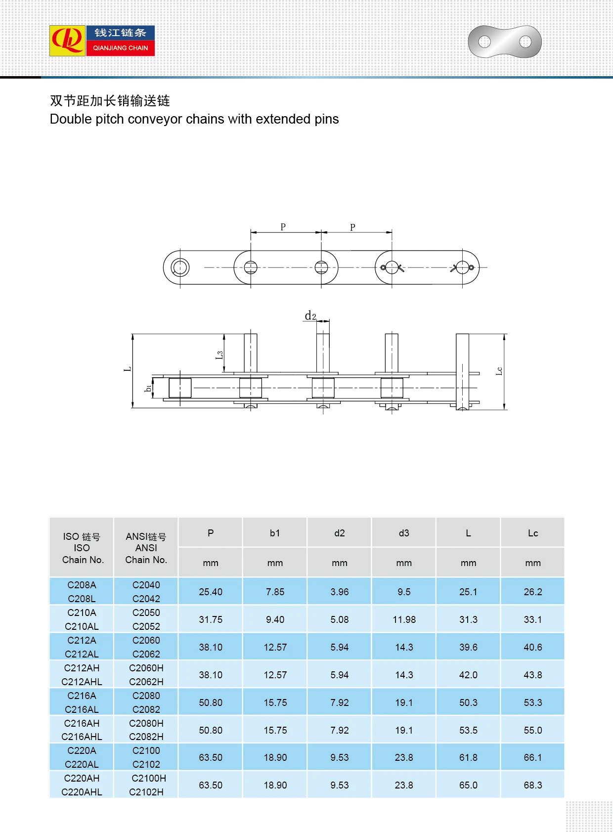 Double pitch conveyor chain na may pinahabang mga pin