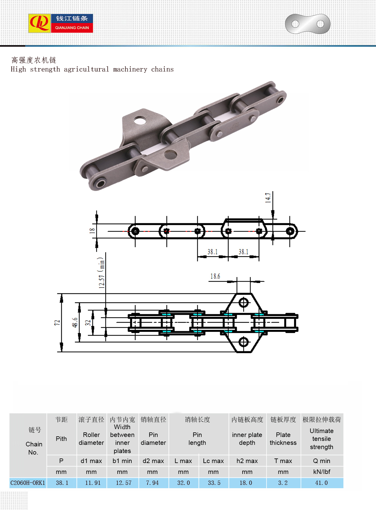 Ang High Strength Agricultural Machinery Chains ay may wear resistance, lakas at buhay ng serbisyo, at angkop para sa iba't ibang kumplikadong kondisyon sa pagtatrabaho. Ang mga de-kalidad na materyales na bakal na haluang metal ay ginagamit, at ang tensile strength at fatigue life ng chain ay pinahusay sa pamamagitan ng mga proseso ng heat treatment (tulad ng carburizing, tempering, at quenching). Ang ibabaw ng chain contact ay espesyal na pinatigas, na may makinis na ibabaw at magandang wear resistance, na angkop para sa high-frequency na trabaho. Tinitiyak ng teknolohiya sa pagpoproseso ng katumpakan na ang mga chain link ay malapit na tugma, tumatakbo nang maayos, at binabawasan ang ingay at vibration. Maaaring i-customize ang iba't ibang pitch, lakas at anyo (tulad ng mga roller chain, accessory chain, bent plate chain, atbp.) ayon sa mga sumusuportang pangangailangan ng iba't ibang makinarya at kagamitan sa agrikultura. Ginagamit sa mekanismo ng paghahatid ng paghahatid, pagputol at paggiik ng trigo, palay, corn harvesters, atbp. Ang pagmamaneho ng seeding disc at fertilizer shaft ay nangangailangan ng chain na tumakbo nang tumpak at matibay. Inilapat sa mga pang-agrikulturang conveyor belt, materyal na elevator, atbp., upang magsagawa ng mga gawaing transportasyon na may mataas na dalas.