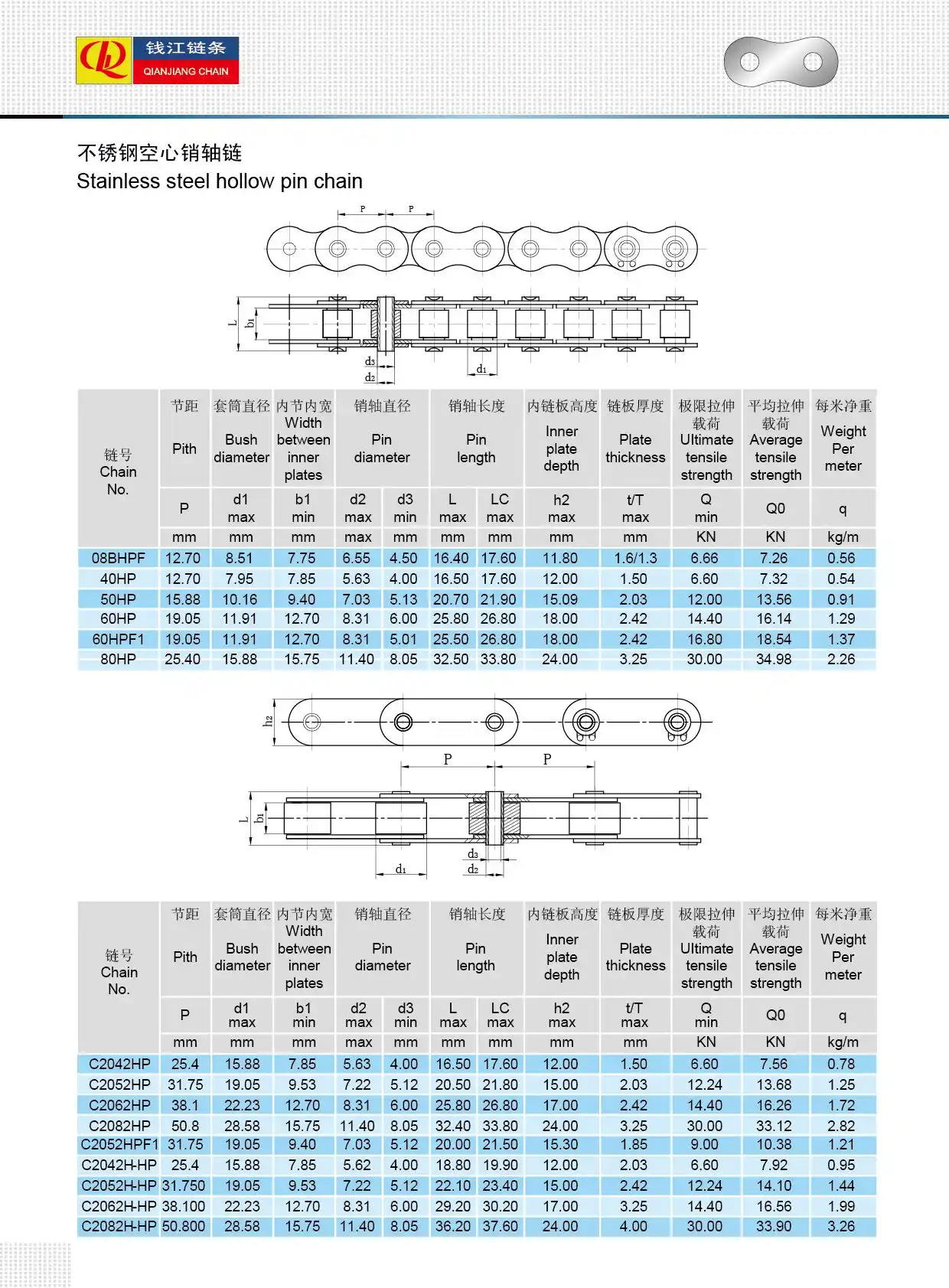 Mula sa pananaw ng aplikasyon, ang mga stainless steel hollow pin chain ay mahusay sa iba't ibang industriya gaya ng pagpoproseso ng pagkain, packaging, pagmamanupaktura ng sasakyan, at higit pa. Ang mga ito ay para sa paghahatid ng mga maseselang produkto, pagtanggap ng mga attachment para sa mga partikular na gawain, o paggana nang mapagkakatiwalaan sa ilalim ng mga kondisyong may mataas na stress. Pumili ng stainless steel hollow pin chain para sa mas matalinong, mas maaasahang paraan upang matugunan ang iyong mga pang-industriyang pangangailangan!